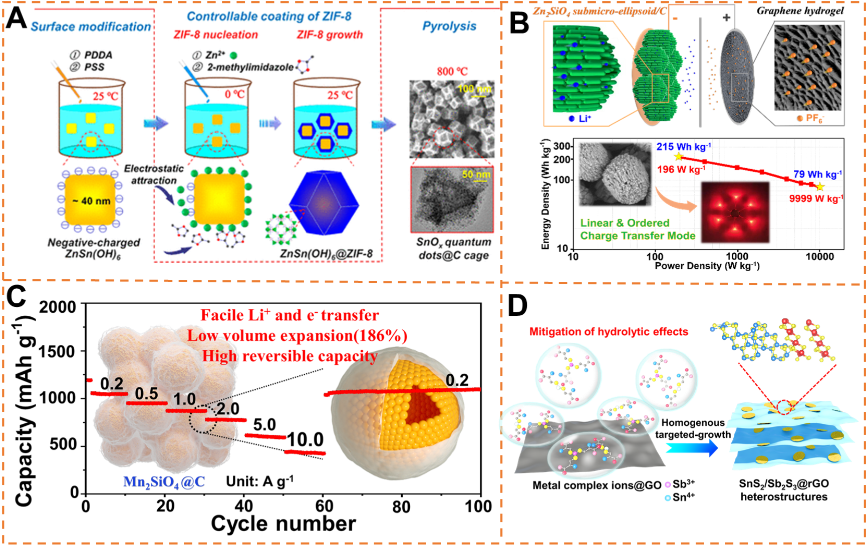 围绕目前锂离子电池/电容器负极材料存在的电导率低、循环过程体积变化大以及电池能量密度和功率密度低的关键性问题,设计合成了氮掺杂炭修饰的锡基量子点材料,实现超高的储锂容量(比容量>1800 mAh g-1);通过靶向络合沉积策略设计合成了均质化SnS2/Sb2S3异质结构,基于异质结构之间的电荷再分布和相互支撑效应,以其为负极组装的锂离子电容器可实现298 W h kg-1的高能量密度和100 kW kg-1的高功率密度,为高能量/功率密度和高循环稳定性储能器件的发展提供了有益思路和借鉴(ACS Nano,2021, 15, 7021; J. Mater. Chem. A, 2022, 10, 17561; ACS Appl. Mater. Interfaces, 2023, 15, 39363; ACS Appl. Mater. Interfaces, 2022, 14, 25962; New Carbon Mater. 2022, 37, 59)。