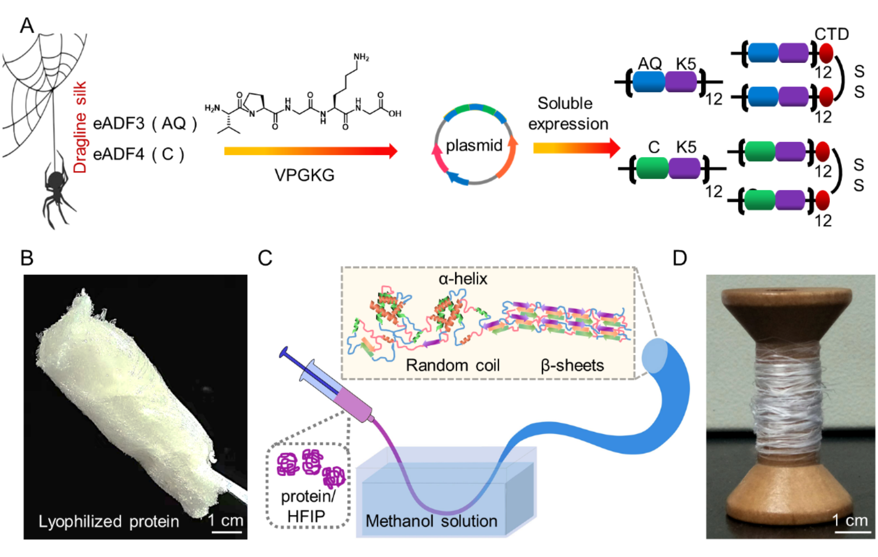 首先,通过融合表达的方式,获得了四种模块化人工蛛丝蛋白。在模块化蛋白体系中,蛛丝蛋白的poly(A)基序可以形成β-sheet微晶结构为纤维强度提供保障,GPGQQ基序可形成螺旋结构赋予纤维良好延展性和韧性;具有柔性结构的类弹性蛋白基序为纤维提供韧性支持,同时类弹性蛋白模块的亲水性促进了模块化重组蛛丝蛋白可溶性表达。此外,引入天然蛛丝蛋白的羧基末端结构域(CTD),有助于蛋白分子间形成交联网络,同时促进β-sheet结构的形成,从而提升纤维力学性能。这些人工蛛丝蛋白纤维的韧性可达200 MJ/m3,高于目前已报道的重组蜘蛛蛋白基纤维。