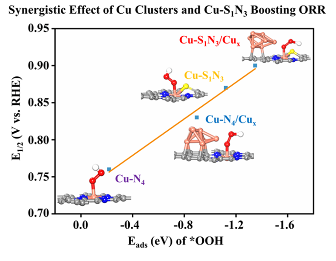 性能测试表明,Cu-S1N3/Cux的起始电位(Eonset)为1.04 V,半波电位(E1/2)为0.90 V,优于目前最先进的Pt/C催化剂。受配位环境和界面效应协同作用调控的金属单原子,其d带中心和对*OOH中间体的吸附能力均与半波电位和Tafel斜率(反应动力学)线性相关。这表明单原子金属d带中心变化和*OOH中间体的吸附能力可以作为衡量ORR中催化性能的依据。