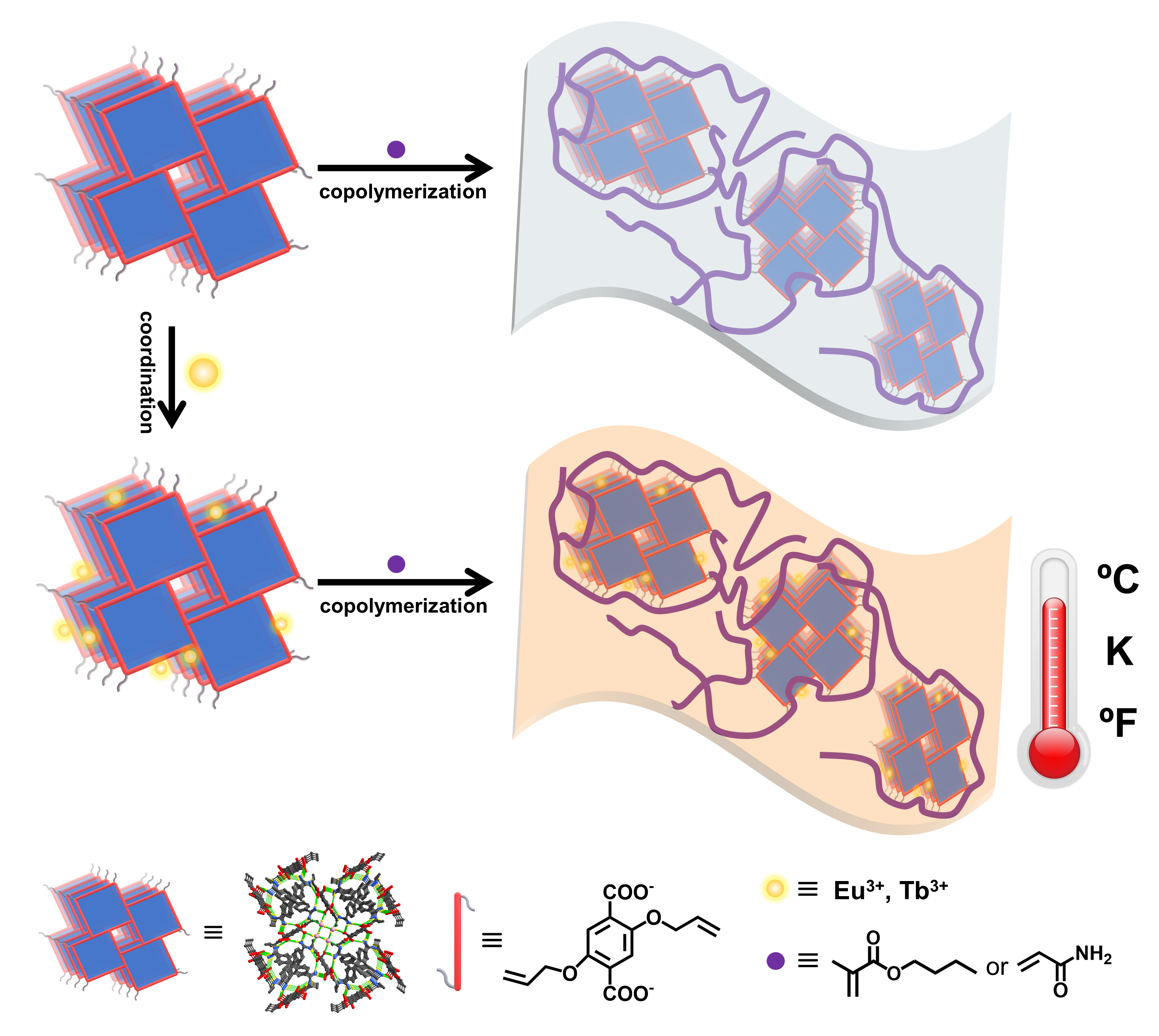 近日,我院李志强课题组通过电荷辅助氢键制备含可聚合位点的HOF(HOF-50),之后与单体共聚构筑了共价交联的HOF/聚合物杂化膜。该杂化膜不仅保留了HOF的结晶性,还可以通过改变聚合单体来调节杂化膜的亲疏水性、机械强度、透明度和柔韧性。另外,通过将镧系元素锚定在HOF-50上(HOF-50-Ln),不仅保持了镧系元素的特征发光颜色,并在苛刻的条件下表现出高灵敏度的温度传感行为和近乎最佳的可视化能力。