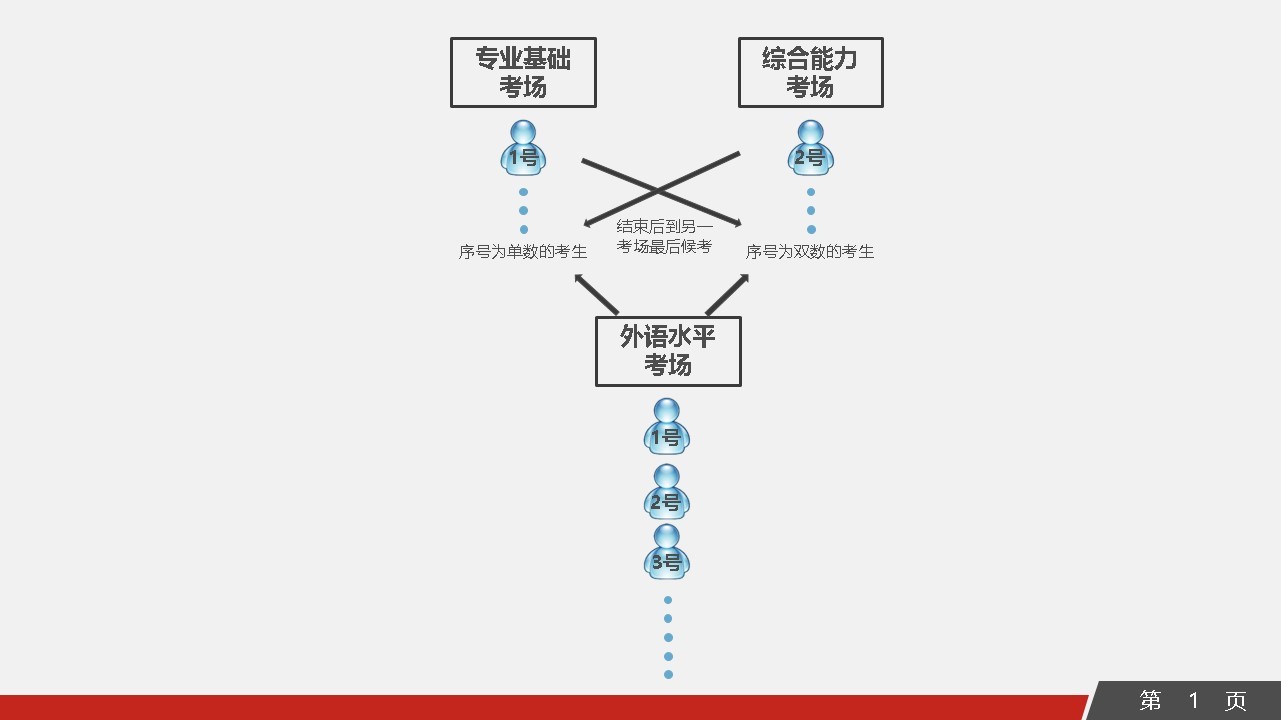 该专业考生分二批进行测试,每批次考生按顺序(系统随机安排,正式复试时重新排序)先进行外语水平测试,外语水平测试结束后,序号为单数的考生进入专业基础考场进行测试,双号的考生进入综合能力考场进行测试,结束后到另一考场等候。