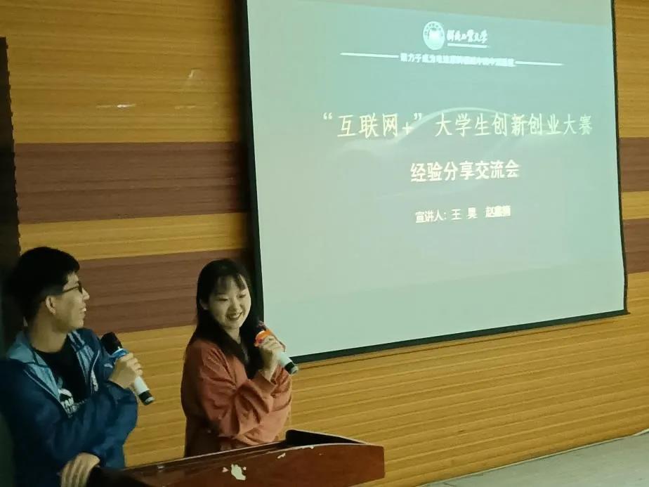 接下来是赵鑫楠和王昊同学为同学们带来的“互联网+”大学生创新创业大赛的经验分享,为大家细致讲解了竞赛的难度评估、前期准备、竞赛收获及项目计划书书写的注意事项等问题,同时表达对同学们的鼓励和对学院的竞赛前景的美好期盼。讲解全程生动活泼,内容详尽,气氛十分活跃。