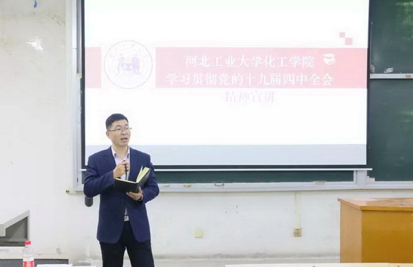 郭宏飞按照校党委要求,全文传达了“河北工业大学学习贯彻党的十九届四中全会精神宣讲提纲”,向全体参会教职工介绍了党中央在“两个一百年”奋斗目标历史交汇点上召开的这次十分重要的会议,是在新中国成立70周年之际、我国处于中华民族伟大复兴关键时期召开的一次具有开创性、里程碑意义的会议;做出的《中共中央关于坚持和完善中国特色社会主义制度、推进国家治理体系和治理能力现代化若干重大问题的决定》(以下简称《决定》)深入回答了在我国国家制度和国家治理体系上“坚持和巩固什么、完善和发展什么”这个重大政治问题,集中了全党智慧,反映了人民意愿,是一篇马克思主义的纲领性文献,也是一篇马克思主义的政治宣言书。郭宏飞从“充分认识坚持和完善中国特色社会主义制度、推进国家治理体系和治理能力现代化的重大意义”、“深刻领会中国特色社会主义制度和国家治理体系的显著优势,坚定中国特色社会主义制度自信”、“准确把握坚持和完善中国特色社会主义制度、推进国家治理体系和治理能力现代化的总体要求、总体目标和重点任务”、“加强党的领导,确保全会确定的各项目标任务全面落实到位”四个方面对“决定”进行了深入解读。