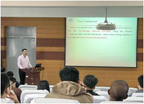 张教授结合自己课题组在CO2的资源化利用以及新型功能性二氧化碳储存材料构建所做的研究工作,从以下四个方面进行了讲解,(1)工业CO2废气的资源现状以及传统处理方法;(2)关于新型功能性二氧化碳储存材料的提出和研究进展;(3)二氧化碳储存材料的潜在利用价值及工业推广成果;(4)其他工业废气(如CS2、SO2等)捕集并资源化利用的设想。CO2的资源化利用是当今研究的热点课题,报告内容丰富,给研究生很大启示,与会师生围绕CO2资源化技术与张教授进行了热烈讨论。最后,张教授以亲身经历并结合其学生中的典型案例叮嘱同学们要多看多问,不要盲目动手,告诫大家在求学科研的道路上想要获得学术成就,就必须付出辛勤的努力,科研过程无捷径可走。