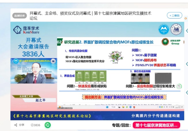 会上,北京理工大学赵之平教授以“分离膜内分子传递通道构建”为题,为参会人员作了精彩大会邀请报告。来自清华大学、天津大学、北京理工大学、北京化工大学、北京工业大学、天津工业大学、北京师范大学、中国矿业大学、北京交通大学、北京建筑大学、北京工商大学、北京林业大学、南开大学、天津科技大学、天津理工大学、河北工业大学、燕山大学、河北科技大学、河北工程大学、中国科学院过程工程研究所、中国科学院生态环境研究中心、中国科学院化学研究所、重庆理工大学等单位的190余名研究生作专题报告,内容涵盖压力驱动及过程,电驱动膜、能源转化与储能膜,渗透汽化膜、疏水膜及过程,气体分离膜及过程,新型膜材料、膜过程,膜耦合、集成及应用等6个主题。来自国内外膜技术领域的专家和研究生积极参与本次论坛的交流,“蔻享学术”平台不完全统计有近两万人次参与论坛直播。