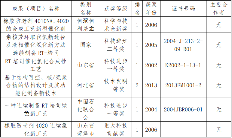 曾获“橡胶防老剂4010NA、4020的合成工艺新型催化剂”项目在2006年获得何梁何利基金产业创新奖、中国橡胶工业协会授予的“中国橡胶工业科技发展带头人”及“优秀科技创新带头人”称号;“亲核芳环取代氢新途径及液相催化氢化新方法连续制备RT-培司”项目在2005年获得国家科技进步二等奖;“RT培司催化氢化合成性工艺”项目在2002年获得山东省技术进步一等奖;“基于结构可控、核/壳聚合物的结构设计及其功能化制备新技术”项目在2013年获得河北省技术发明一等奖;“一种连续制备RT培司绿色新工艺”项目在2004年获得中国石化联合会科技进步⼀等奖;“橡胶防老剂4020连续氢化新工艺”项目在2006年获得山东省菏泽市重大科技进步贡献奖。